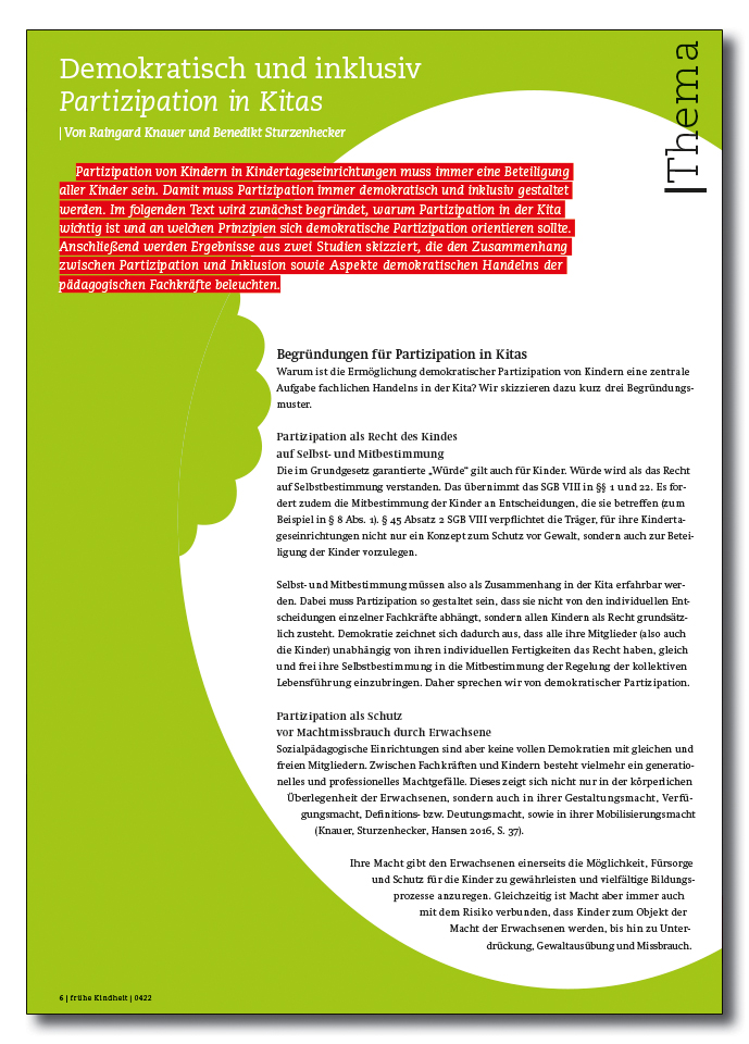Anschließend werden Ergebnisse aus zwei Studien skizziert, die den Zusammenhang zwischen Partizipation und Inklusion sowie Aspekte demokratischen Handelns der pädagogischen Fachkräfte beleuchten.