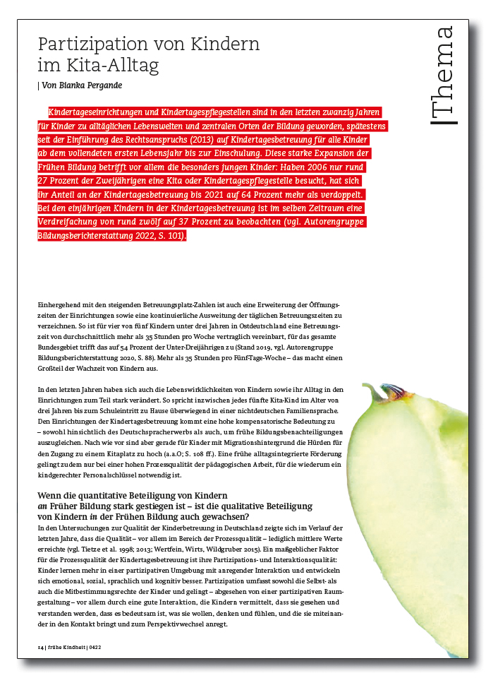 Kindertageseinrichtungen und Kindertagespflegestellen sind in den letzten zwanzig Jahren für Kinder zu alltäglichen Lebenswelten und zentralen Orten der Bildung geworden, spätestens seit der Einführung des Rechtsanspruchs (2013) auf Kindertagesbetreuung für alle Kinder ab dem vollendeten ersten Lebensjahr bis zur Einschulung.
