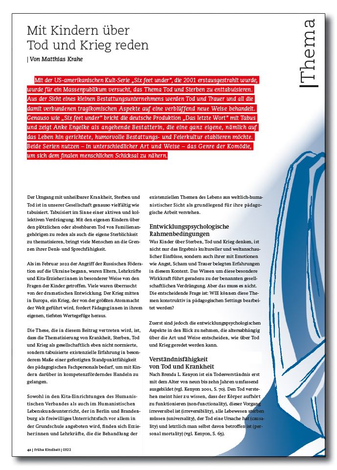 Mit der US-amerikanischen Kult-Serie „Six feet under”, die 2001 erstausgestrahlt wurde, wurde für ein Massenpublikum versucht, das Thema Tod und Sterben zu enttabuisieren.