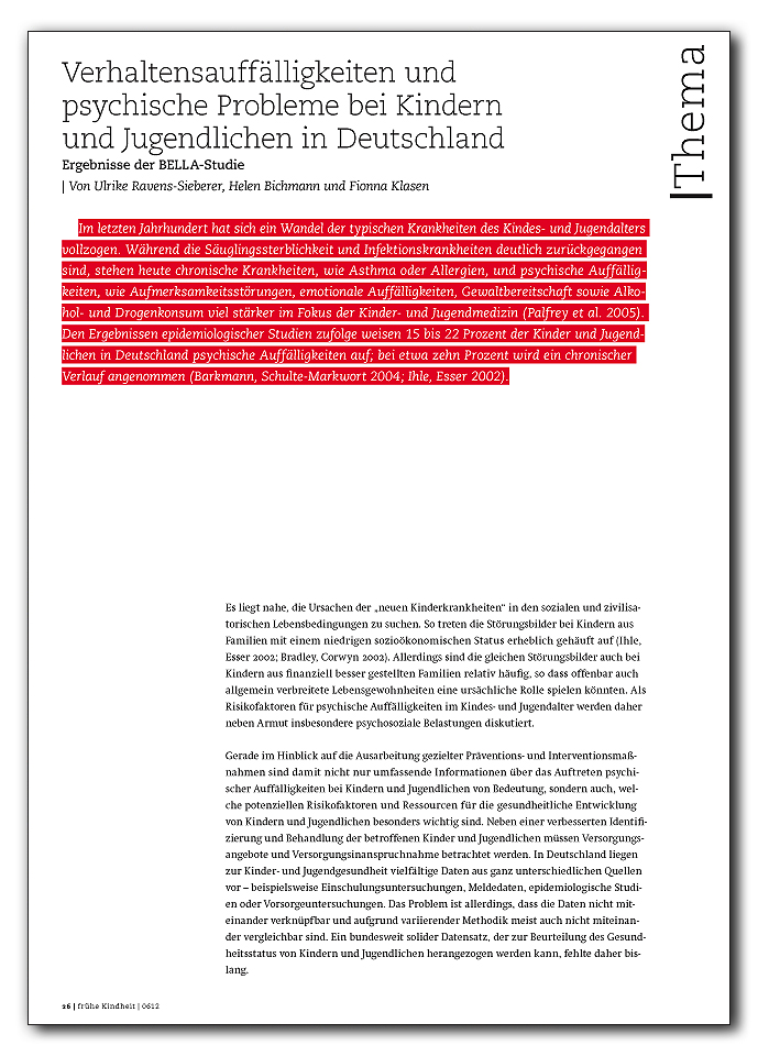 Im letzten Jahrhundert hat sich ein Wandel der typischen Krankheiten des Kindes- und Jugendalters vollzogen. Während die Säuglingssterblichkeit und Infektionskrankheiten deutlich zurückgegangen sind, stehen heute chronische Krankheiten, wie Asthma oder Allergien, und psychische Auffälligkeiten, wie Aufmerksamkeitsstörungen, emotionale Auffälligkeiten, Gewaltbereitschaft sowie Alkohol- und Drogenkonsum viel stärker im Fokus der Kinder- und Jugendmedizin (Palfrey et al. 2005). Den Ergebnissen epidemiologischer Studien zufolge weisen 15 bis 22 Prozent der Kinder und Jugendlichen in Deutschland psychische Auffälligkeiten auf; bei etwa zehn Prozent wird ein chronischer Verlauf angenommen (Barkmann, Schulte-Markwort 2004; Ihle, Esser 2002).