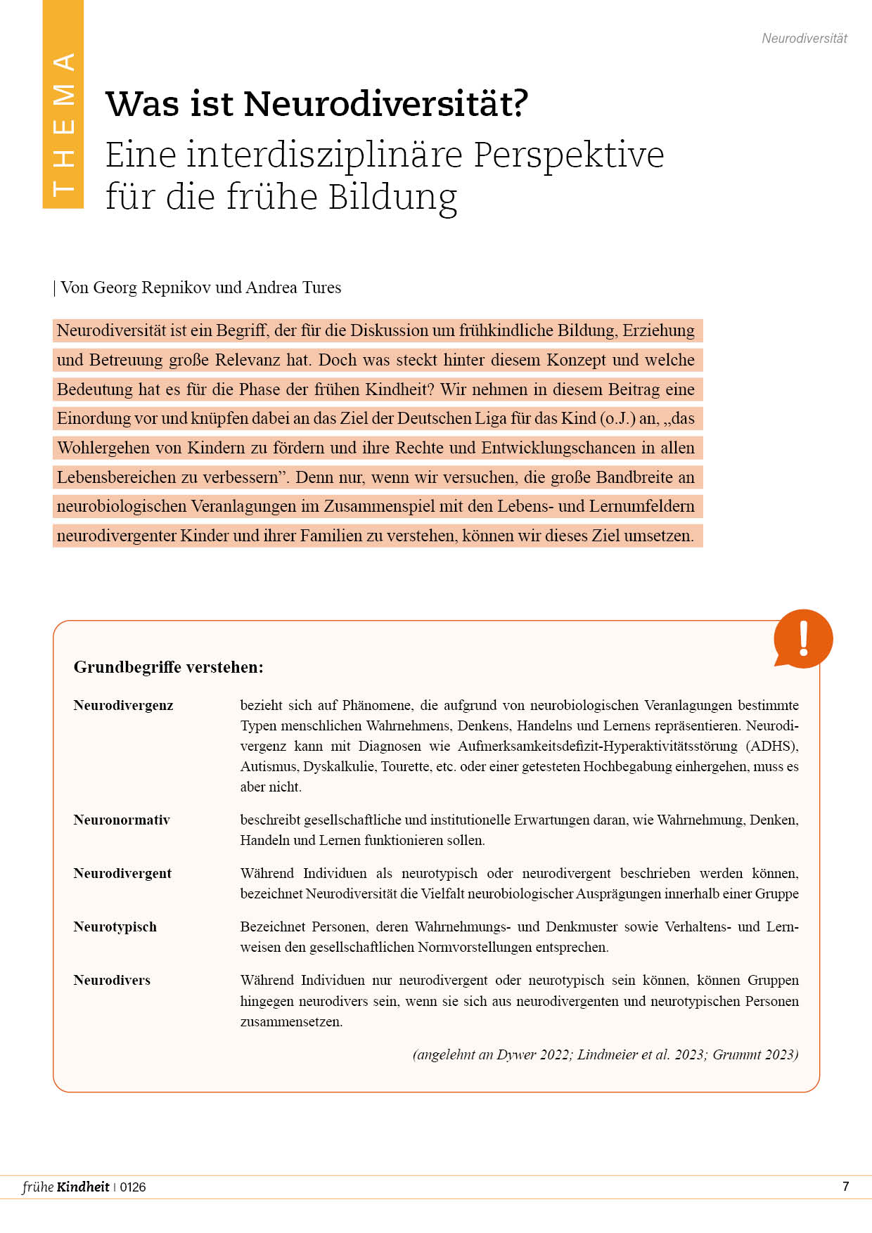 Neurodiversität ist ein Begriff, der für die Diskussion um frühkindliche Bildung, Erziehung und Betreuung große Relevanz hat. Doch was steckt hinter diesem Konzept und welche Bedeutung hat es für die Phase der frühen Kindheit? Wir nehmen in diesem Beitrag eine Einordung vor und knüpfen dabei an das Ziel der Deutschen Liga für das Kind (o.J.) an, „das Wohlergehen von Kindern zu fördern und ihre Rechte und Entwicklungschancen in allen Lebensbereichen zu verbessern”. Denn nur, wenn wir versuchen, die große Bandbreite an neurobiologischen Veranlagungen im Zusammenspiel mit den Lebens- und Lernumfeldern neurodivergenter Kinder und ihrer Familien zu verstehen, können wir dieses Ziel umsetzen.