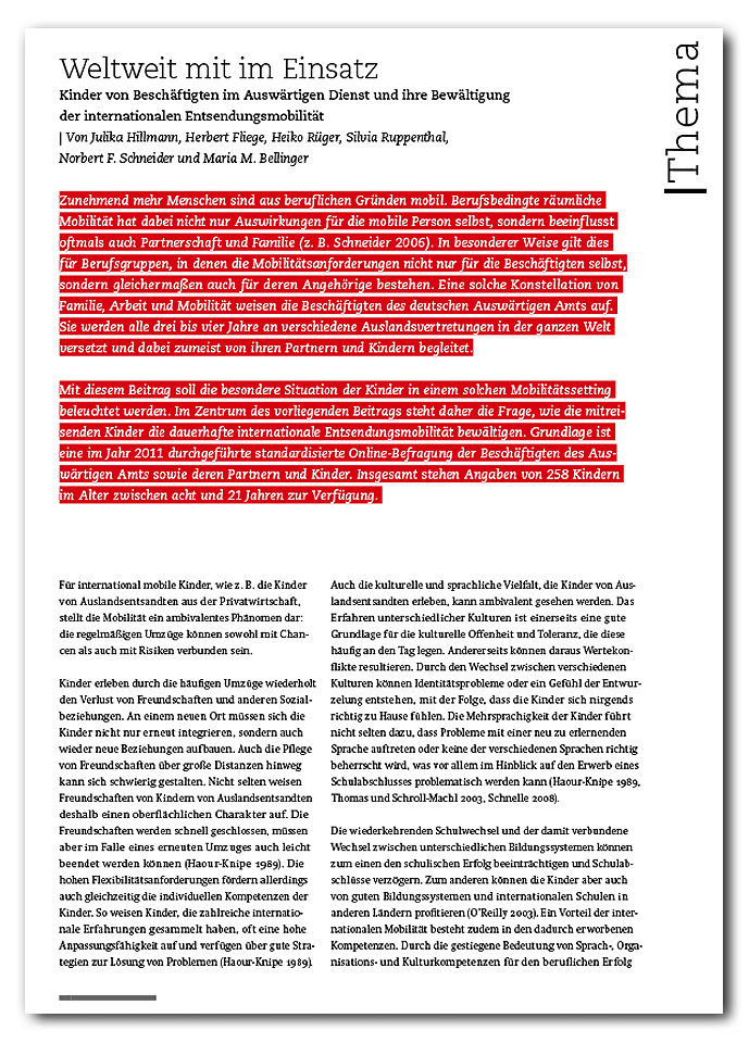 Zunehmend mehr Menschen sind aus beruflichen Gründen mobil. Berufsbedingte räumliche Mobilität hat dabei nicht nur Auswirkungen für die mobile Person selbst, sondern beeinflusst oftmals auch Partnerschaft und Familie (z. B. Schneider 2006). In besonderer Weise gilt dies für Berufsgruppen, in denen die Mobilitätsanforderungen nicht nur für die Beschäftigten selbst, sondern gleichermaßen auch für deren Angehörige bestehen. Eine solche Konstellation von Familie, Arbeit und Mobilität weisen die Beschäftigten des deutschen Auswärtigen Amts auf. Sie werden alle drei bis vier Jahre an verschiedene Auslandsvertretungen in der ganzen Welt versetzt und dabei zumeist von ihren Partnern und Kindern begleitet.