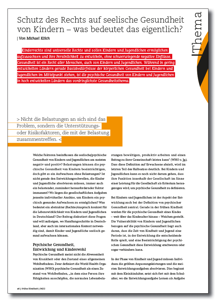 Kinderrechte sind universelle Rechte und sollen Kindern und Jugendlichen ermöglichen aufzuwachsen und ihre Persönlichkeit zu entwickeln, ohne schwerwiegende negative Einflüsse. Gesundheit ist ein Recht aller Menschen, auch von Kindern und Jugendlichen. Während in gering entwickelten Ländern gerade Basisbedürfnisse der körperlichen Gesundheit bei Kindern und Jugendlichen im Mittelpunkt stehen, ist die psychische Gesundheit von Kindern und Jugendlichen in hoch entwickelten Ländern das vordringlichste Gesundheitsthema.