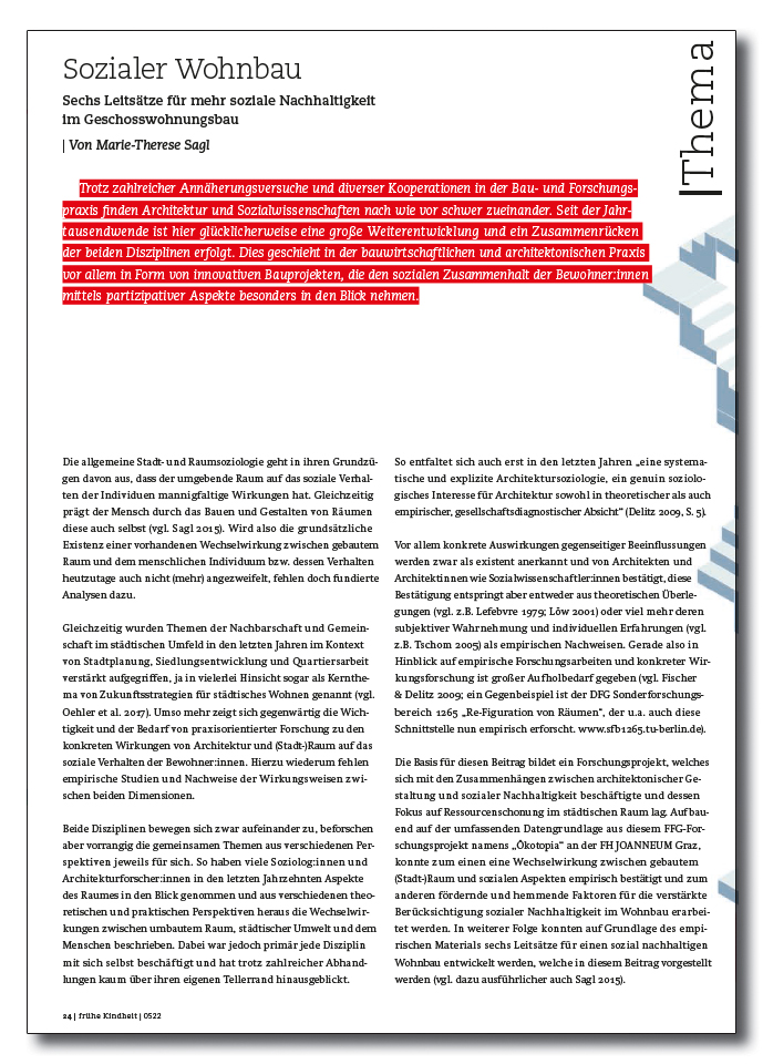 Trotz zahlreicher Annäherungsversuche und diverser Kooperationen in der Bau- und Forschungspraxis finden Architektur und Sozialwissenschaften nach wie vor schwer zueinander. Seit der Jahrtausendwende ist hier glücklicherweise eine große Weiterentwicklung und ein Zusammenrücken der beiden Disziplinen erfolgt. Dies geschieht in der bauwirtschaftlichen und architektonischen Praxis vor allem in Form von innovativen Bauprojekten, die den sozialen Zusammenhalt der Bewohner:innen mittels partizipativer Aspekte besonders in den Blick nehmen.