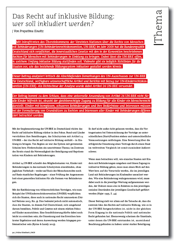 Dieser Beitrag analysiert kritisch die Abschließenden Bemerkungen des UN-Ausschusses zur UN-BRK für Deutschland, verfügbare wissenschaftliche Artikel und Berichte mit Bezug zur UN-Kinderrechtskonvention (UN-KRK). Als Richtschnur der Analyse wurde dabei Artikel 24 UN-BRK verwendet.