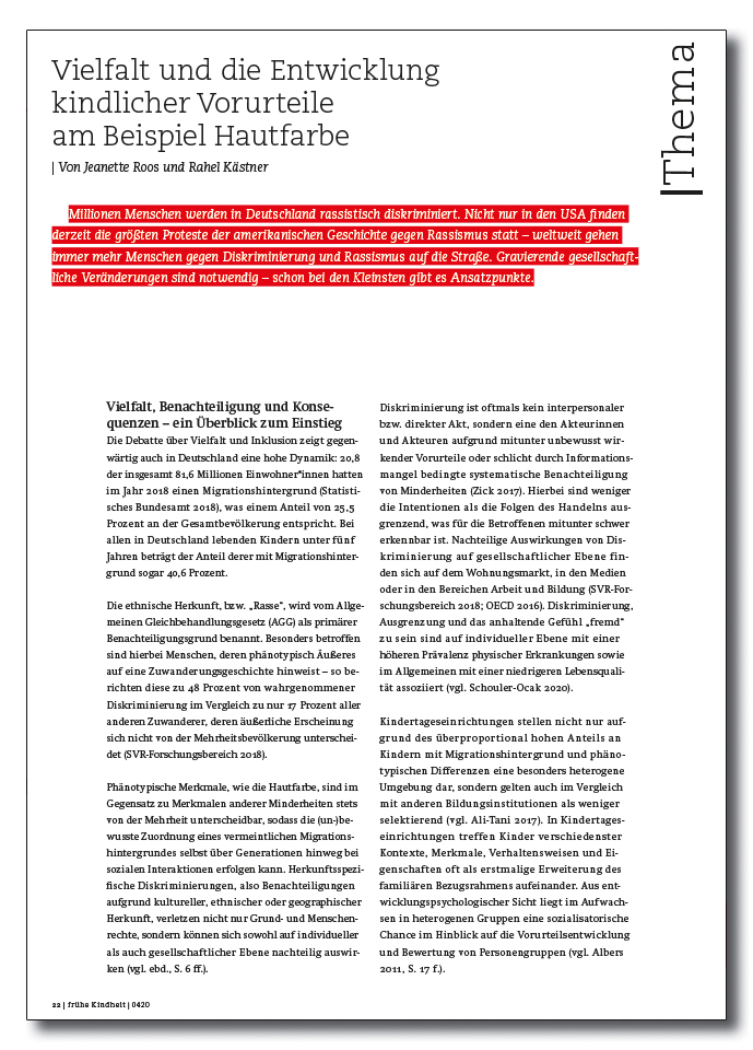 Millionen Menschen werden in Deutschland rassistisch diskriminiert. Nicht nur in den USA finden derzeit die größten Proteste der amerikanischen Geschichte gegen Rassismus statt – weltweit gehen immer mehr Menschen gegen Diskriminierung und Rassismus auf die Straße. Gravierende gesellschaftliche Veränderungen sind notwendig – schon bei den Kleinsten gibt es Ansatzpunkte.