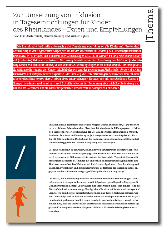 Die Rheinland-Kita-Studie untersuchte die Umsetzung von Inklusion für Kinder mit (drohender) Behinderung in den Tageseinrichtungen für Kinder des Rheinlands im Auftrag des Landschaftsverbandes Rheinland. In 42 Prozent der antwortenden Einrichtungen (N=1.811) wurden bislang noch keine Kinder mit (drohender) Behinderung betreut. Nur wenig Beachtung bei der Umsetzung von Inklusion finden bislang Kinder mit erhöhtem Risiko für die weitere Entwicklung (sogenannte Risikokinder). Für eine qualitativ adäquate Betreuung der Kinder mit Behinderung und der sogenannten Risikokinder fordern die Kitas Fachkräfte mit entsprechender Expertise. Mit Blick auf die Unterstützungsmöglichkeiten von inklusiv arbeitenden Kitas kommt dem Aufbau eines entsprechenden Netzwerkes mit verschiedenen Kooperationspartnerinnen und -partnern und Schnittstellen in der Betreuung eine wichtige Bedeutung zu. Ein solches Netzwerk könnte Kitas mit fehlenden Ressourcen vorübergehend entlasten.